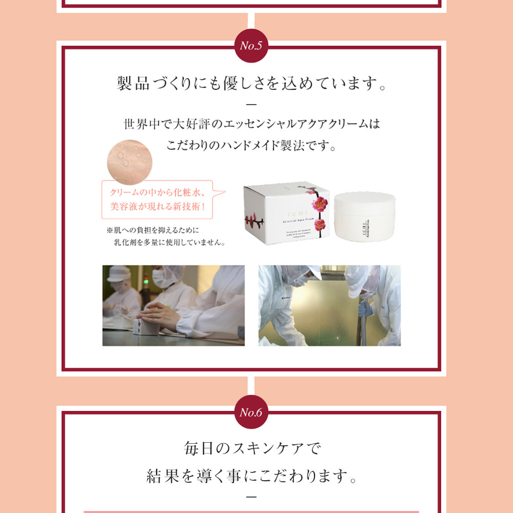 | ご使用方法 | 1.プレミアムクレンジングオイル”アクアブレンド”蓋を閉めたまま本体を振り、水層と油層とをしっかりと混ぜます。清潔な手のひらに適量とり、お顔全体に馴染ませていきます。(アイメイクを落とす場合は追加で丁寧に馴染ませます)少量の水やぬるま湯を手に加え馴染ませ乳化させた後、水またはぬるま湯で丁寧に洗い流します。W洗顔不要で洗いあがりさっぱりです。 2.プレミアムモイスチャライザー適量手にとり、お顔全体に両手で押さえるようにやさしくなじませます。(目元の美容液としてもおすすめです。) 3.エッセンシャルアクアクリームはパール粒(直径約7mm)ほどとり、マッサージをするようにお顔全体によくなじませます(化粧水、美容液成分の滴が現れますのでそのままなじませてください) |